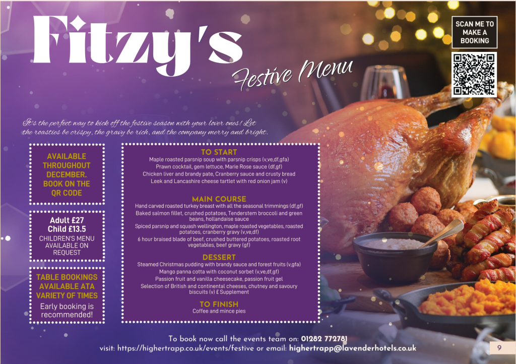 This December, Fitzy’s welcomes you to enjoy a Festive Menu filled with comforting seasonal favourites and classic Christmas flavours. Begin your celebration with starters such as maple roasted parsnip soup, a refreshing prawn cocktail, or a homely Leek and Lancashire cheese tart.